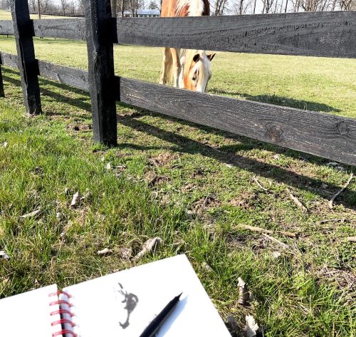 Life drawing horses – sketching them live while they are free in their environment – is both challenging and deeply rewarding. Since early 2024, I have been honored to visit and sketch horses at many horse rescues, therapeutic riding centers, and farms.